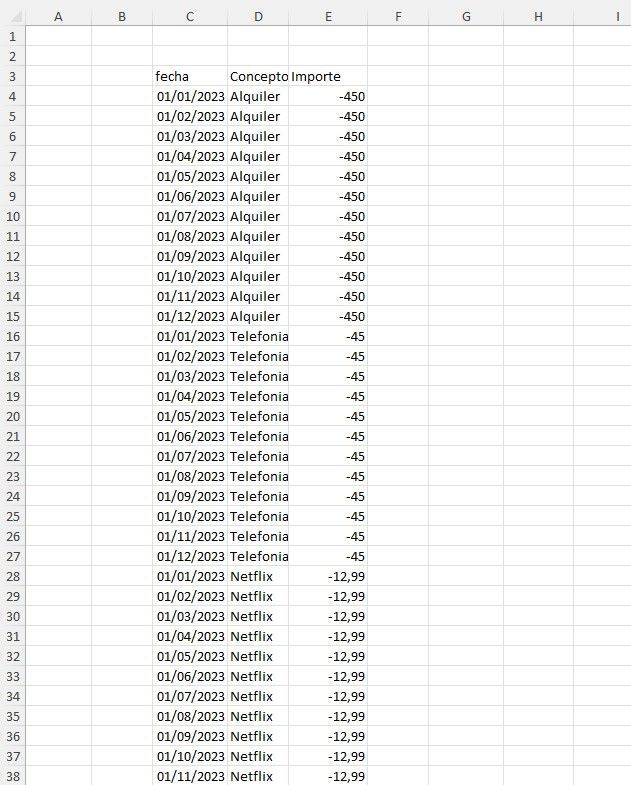 Partiremos de una tabla de información donde vamos a reflejar las fechas, conceptos y cantidades de manera simple, como la siguiente: