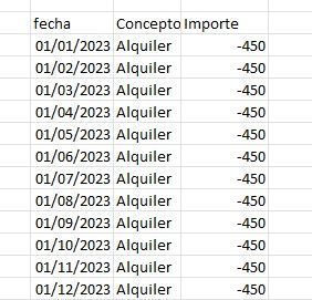 Debemos insertar los datos según correspondan, es decir; día, mes y año; tantas veces como se repliquen a lo largo del año. Por ejemplo, el alquiler lo pagamos todos los meses durante todo el año, si tenemos un gasto que solo se producirá durante los meses de enero a junio y de septiembre a diciembre, entonces no introduciremos los meses de julio y agosto. Como es el caso de las clases de inglés en nuestro ejemplo.